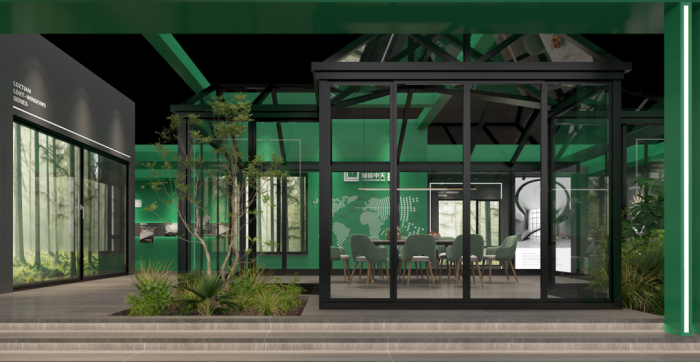 绿盾中天2021广州建博会展馆,在健康色系设计的基础上,运用线条元素装潢展馆,硬朗的门窗线条与不同材质的陈设相映成趣,多了几分生活的灵动趣味。
