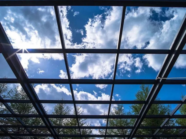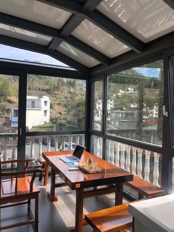 相较于市面大多数普铝阳光房,绿盾中天系统阳光房型材均为断桥结构,内外框软性结合,使阳光房更具保温隔热性,顶部选用遮阳节能玻璃,立面采用光感遮阳百叶玻璃。