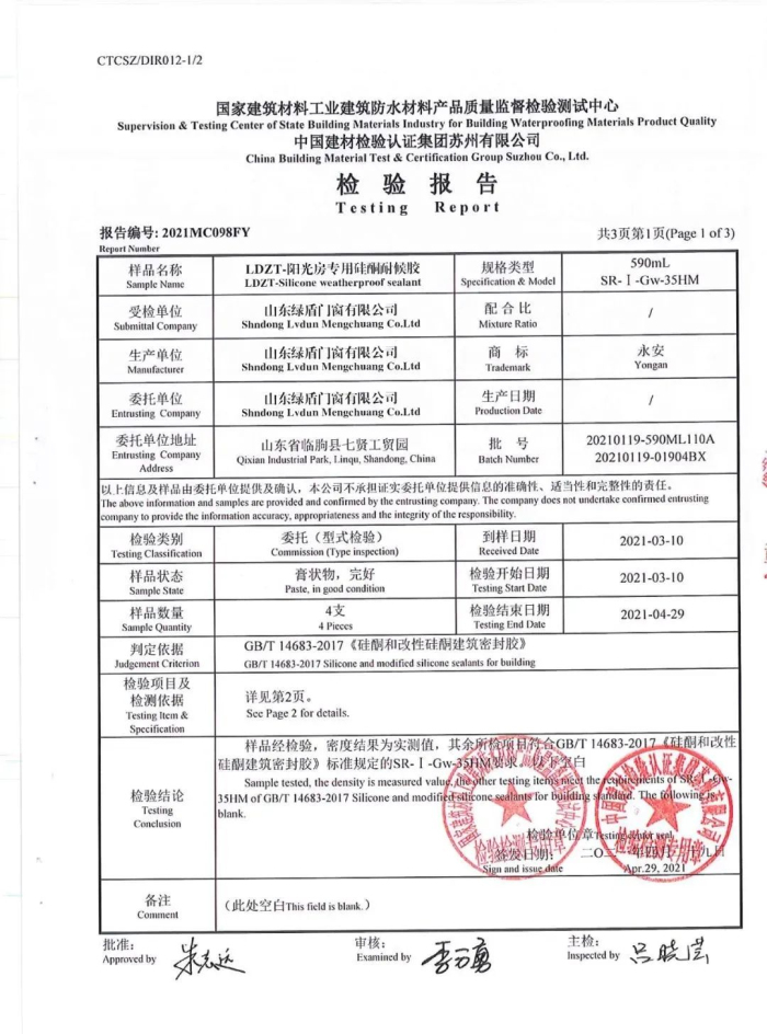 实践是检验真理的标准,绿盾中天阳光房工程硅酮耐候胶均经过机构检测认证,同时符合GB16776-2005的相关要求,使用更安心。